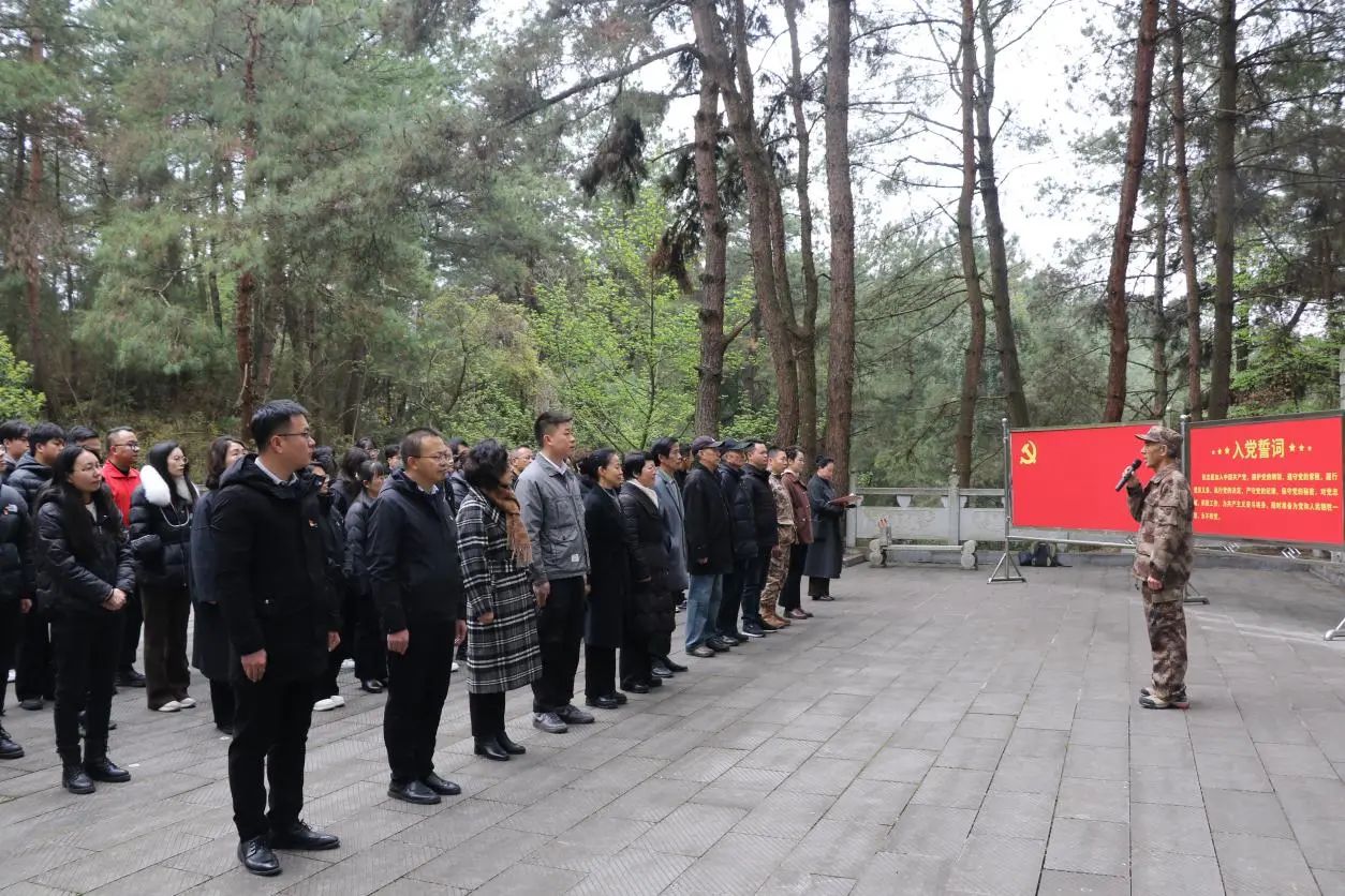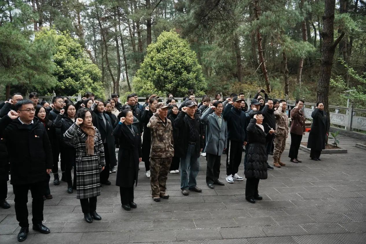 苍松翠柏掩映下的烈士陵园郁郁葱葱,全体党员面向革命烈士纪念碑庄严伫立,深切缅怀革命先烈的丰功伟绩,追思他们英勇顽强、不怕牺牲的革命精神。