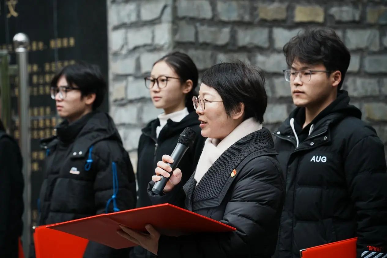 令狐彩桃带领学生代表深情朗诵诗歌《清明》,表达对革命先烈的无限敬仰。全体党员依次向纪念碑敬献花篮和鲜花,寄托哀思,告慰先烈英灵。面对鲜红的党旗,令狐彩桃带领全体党员重温入党誓词。