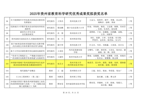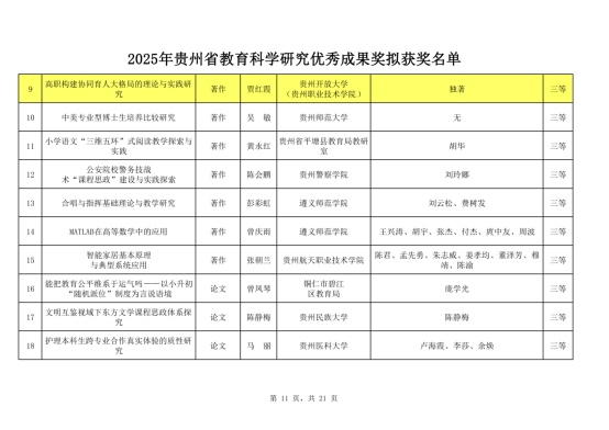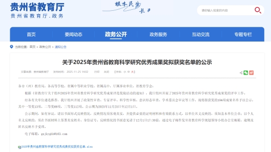 11月25日,贵州省教育厅下发了《关于2025年贵州省教育科学研究优秀成果奖拟获奖名单的公示》,我院院长程守艳老师申报的《高职院校思想政治理论课“四堂联动”的理论与实践》、贾红霞老师申报的《高职构建协同育人大格局的理论与实践研究》、张艺方老师申报的《乡村振兴视域下贵州高职院校毕业生返乡就业创业影响因素及激励机制研究》荣获三等奖,这既是对我院教师科研能力与创新精神的充分肯定,更是我院科研工作稳步推进的集中体现。