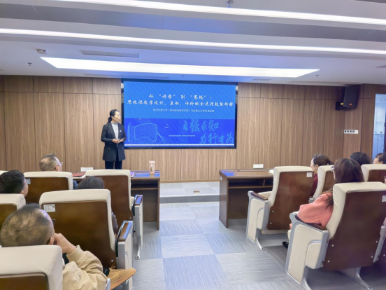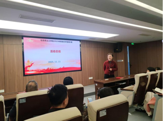 2025年11月11日下午,马克思主义学院在行政楼3楼学术报告厅举办2025年第6期“思政乐学堂”活动。本期活动以“以赛促教 赋能成长”为主题,特邀比赛经验丰富的黄丽娟博士进行分享,活动由思想道德与法治教研室主任肖旭老师主持。马克思主义学院党委书记涂雪霏、全体思政课教师及建筑室内设计256班同学参加本次活动。