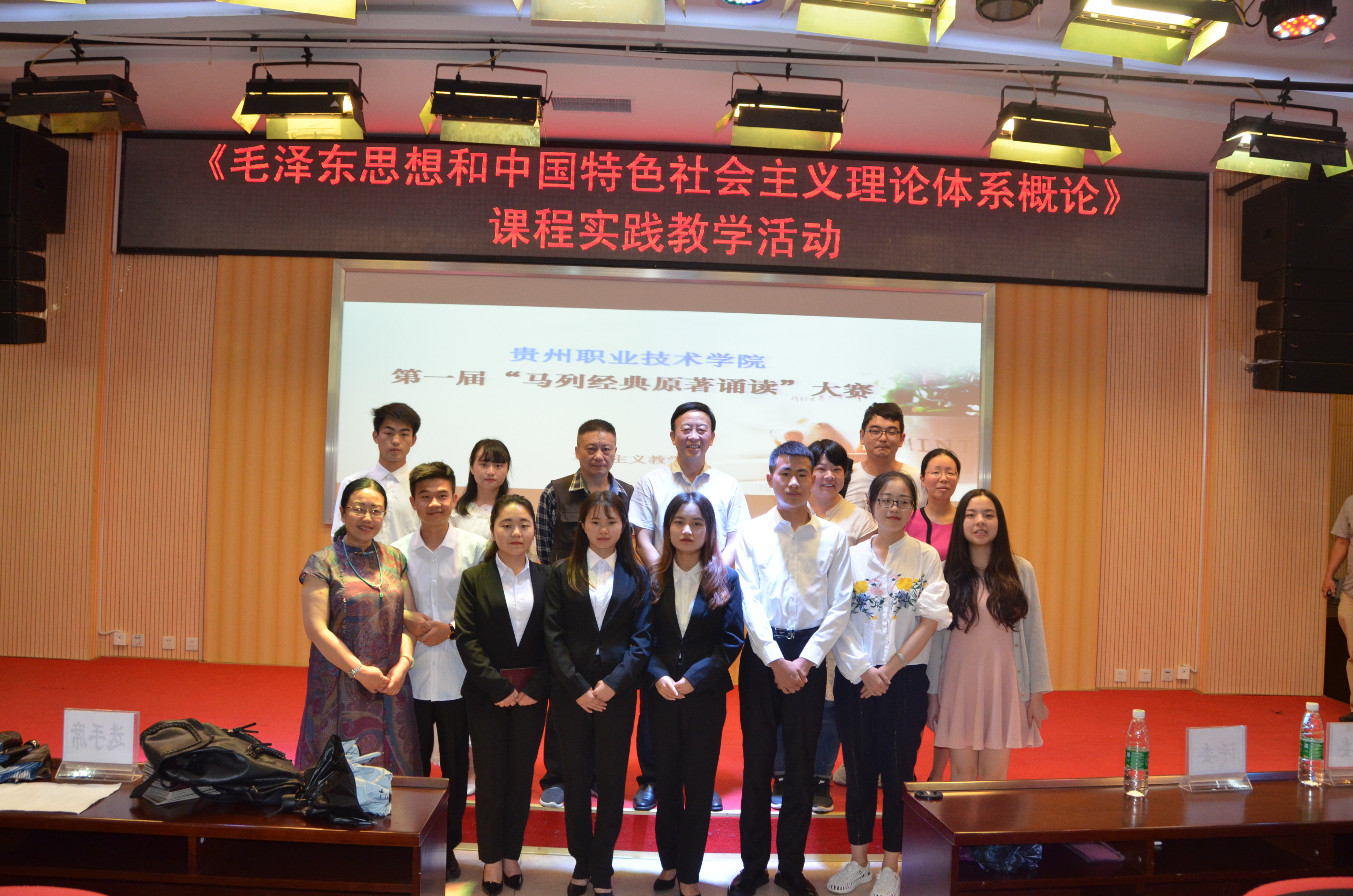 为贯彻落实全国高校思想政治工作会议精神,落实贵州省高校思想政治工作会议精神,迎接学校思想政治工作会议的召开,进一步丰富校园文化生活,丰富思想政治理论课教学的形式,提高青年大学生对马克思主义的信仰,在全校范围内形成学习马克思主义经典理论和阅读红色文学的进步风气,马列主义教学部于6月8日下午,在学院图书馆二楼多功能报告厅,举行了“向经典致敬——马列经典原著诵读”比赛暨《毛泽东思想和中国特色社会主义理论体系概论》实践教学活动。校党委书记邓惠宾老师、副书记郭万才老师参加了活动。《学报》副主编孙鲁痕教授、校办副主任姚楠老师、招就中心副主任李江波老师、学生处孙飞老师、艺术与设计学院陈露老师、谭雪老师、马列部黄丹老师等担任本次活动的评委,马列部全体教师和2016级两百多名同学参加了活动。