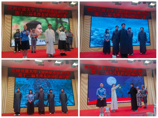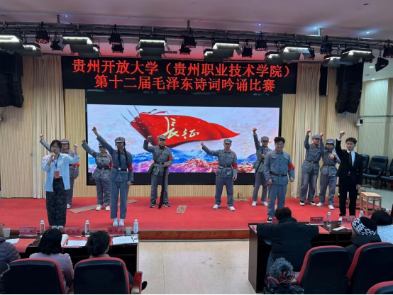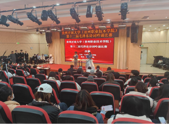 为传承红色基因,弘扬革命文化,深化青年学生对毛泽东思想内涵与毛泽东诗词艺术魅力的理解。2025年12月9日下午,由贵州开放大学(贵州职业技术学院)马克思主义学院主办的第十二届毛泽东诗词吟诵比赛决赛在学校图书馆二楼报告厅隆重举行。现场气氛庄重而热烈,吸引了众多师生到场观摩。马克思主义学院党委书记涂雪霏、马克思主义学院院长程守艳出席比赛。