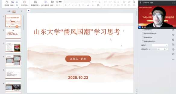 本次活动以政策解读、案例分享、教学研讨交流相结合的形式展开。活动伊始,省校马克思主义学院院长程守艳教授进行政策解读,为参会教师深入剖析了“马院+书院”协同育人的政策背景、核心要求和实施措施,介绍了学校的工作推进情况。程守艳院长要求体系思政课教师深入思考,针对成人学生的特点,如何把“两个结合”融入我们的教育教学和学生管理中,鼓励省校与分校思政课教师共同组建团队,开展“马院+书院”协同育人研究,共同推进开放教育体系“马院+书院”协同育人实践新范式。随后,肖旭博士分享在山东大学学习“儒风国潮”的内容、心得体会以及对于“马院+书院”协同育人的思考。